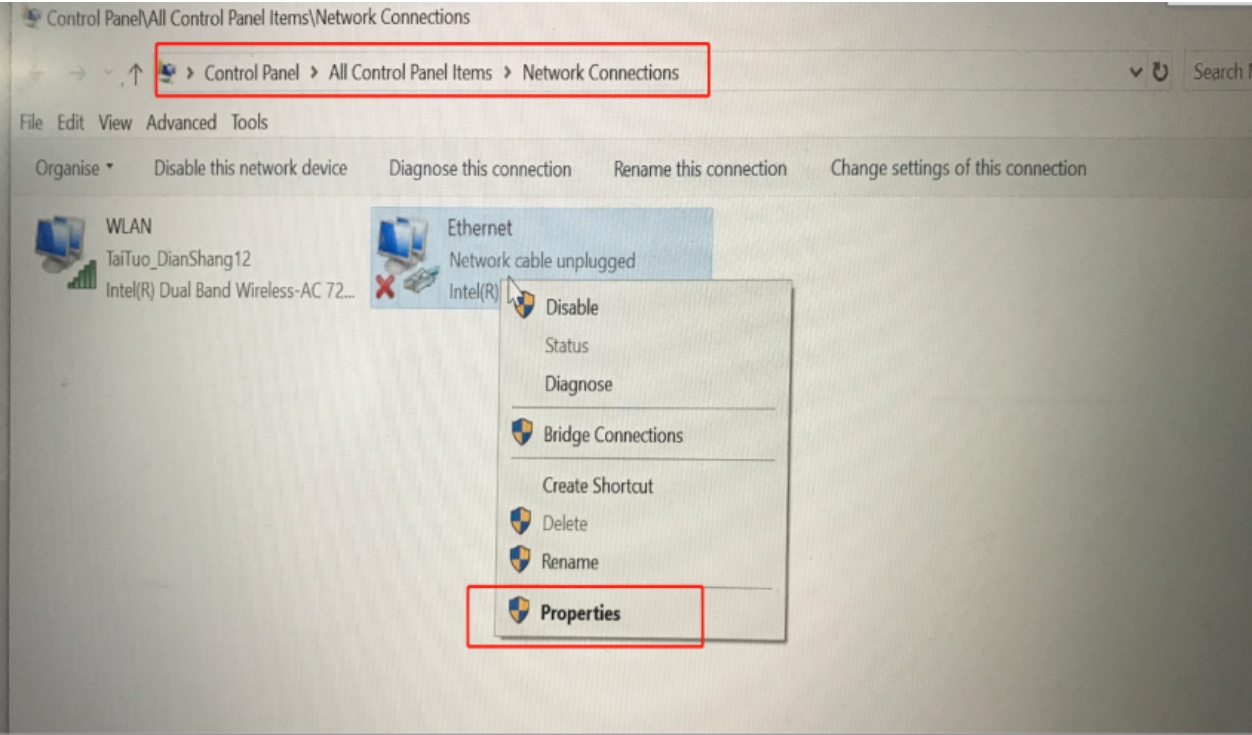 Find the corresponding LAN port, click Local Area Connection,  select Properties—Internet Protocol