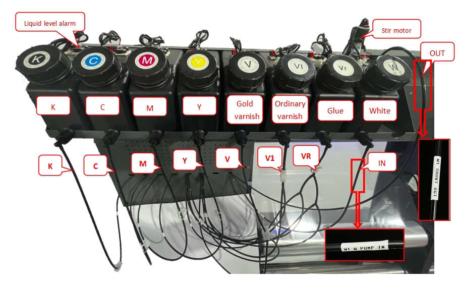 The ink tank of white ink is connected to the power cord of the white ink stirring motor.