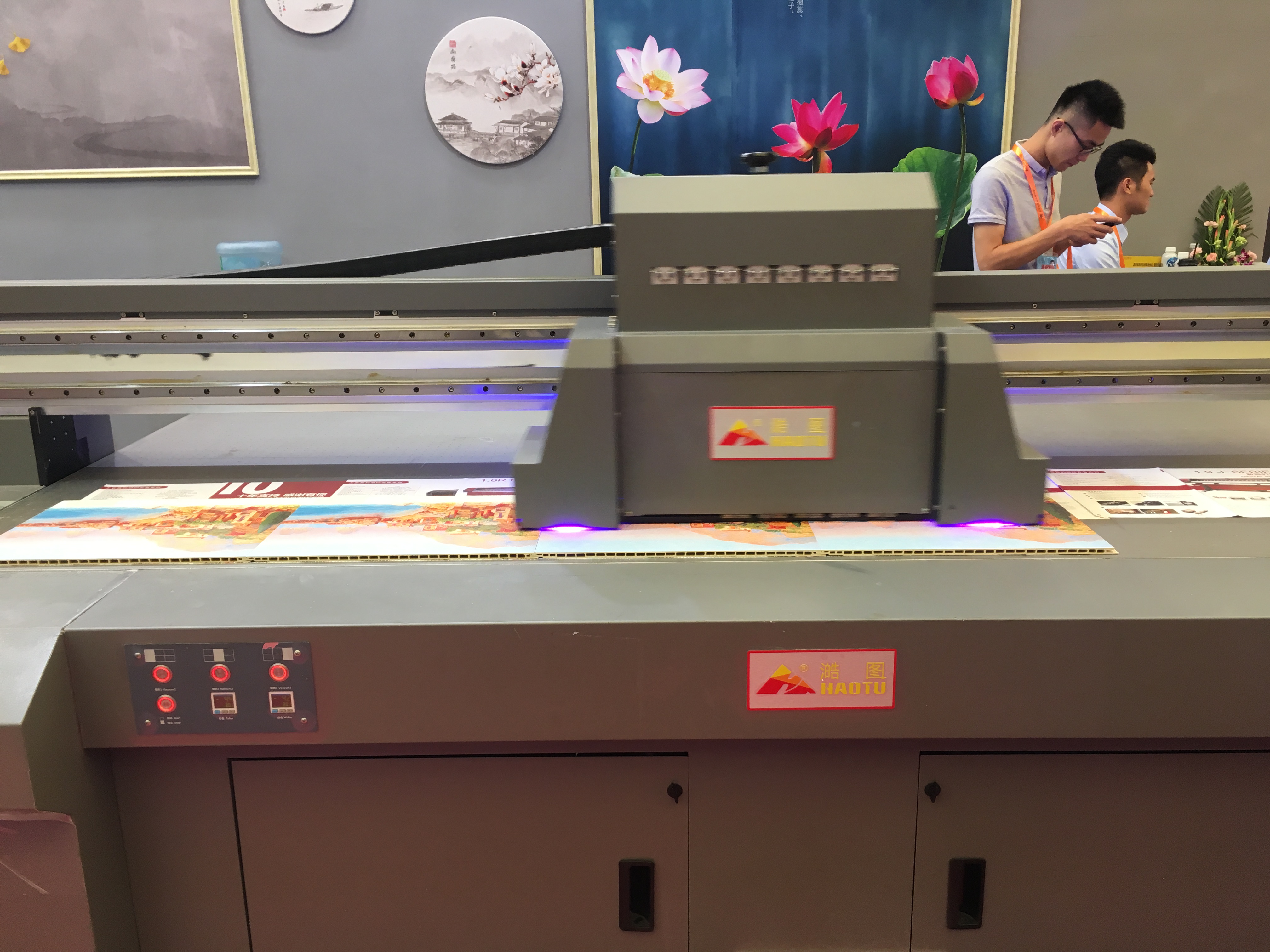 但是現(xiàn)在還是有很多建材商還是不清楚有這樣的技術(shù)啊,我看到現(xiàn)場還有些廠家,生產(chǎn)的一些簡單浮雕效果墻面真的是用雕刻機(jī)去雕刻的,這樣生產(chǎn)速度多慢??!我們的UV平板打印機(jī)都能打5D甚至8D的浮雕效果,速度又快效果又好。那些在我們展會現(xiàn)場看打印機(jī)打浮雕裝飾畫的廠家都表示驚嘆到了,紛紛向我們咨詢UV平板打印機(jī)打印定制建材相關(guān)的問題。