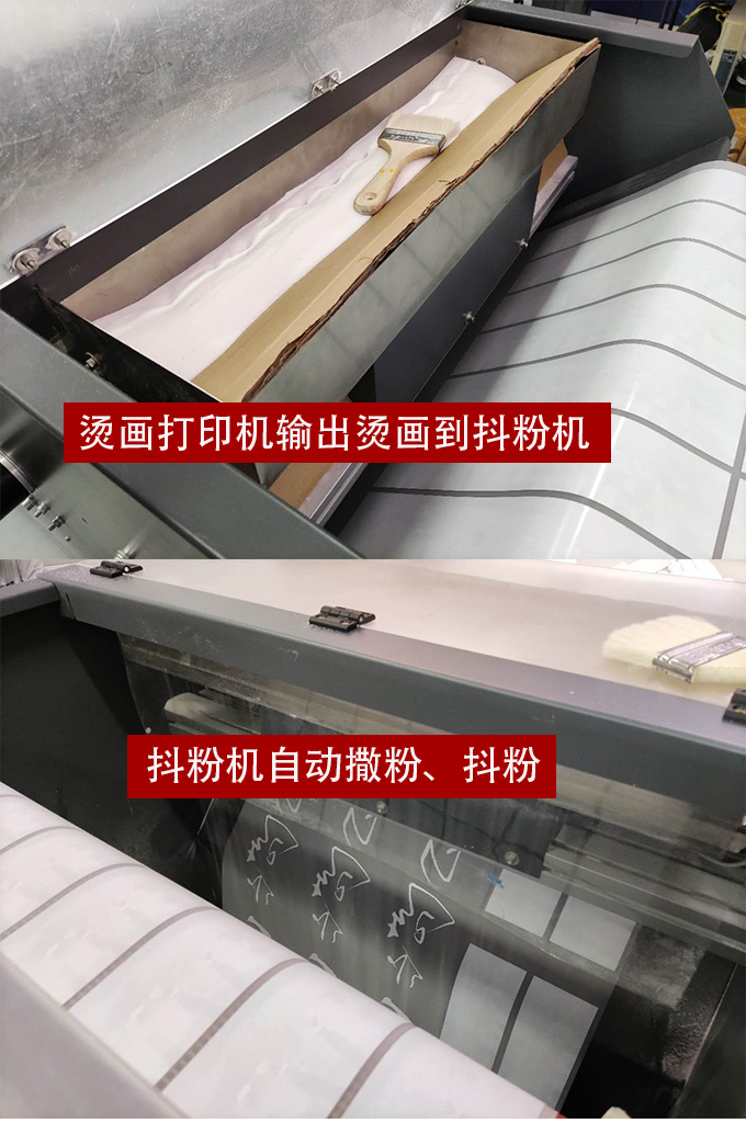 2、設(shè)計(jì)了6段式烘焙系統(tǒng),打印機(jī)前中后三重烘干,打印的圖案再輸出到抖粉機(jī)進(jìn)行預(yù)烘干、加熱熱熔粉、烘干熱熔粉,打印出來的燙畫成品可直接進(jìn)行燙壓或收卷,高效快捷。