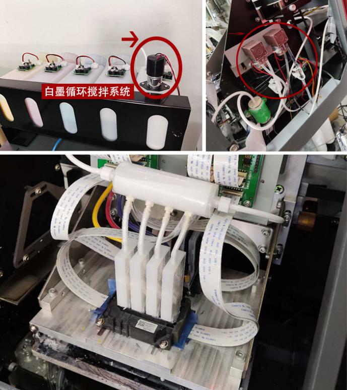 1、在配置上,這款燙畫打印機(jī)搭載2個(gè)4720噴頭,并且在四排聯(lián)供墨盒的基礎(chǔ)上配置了白墨攪拌墨路循環(huán)系統(tǒng),解決了很多客戶擔(dān)心的墨水沉淀帶來白墨噴頭的堵塞問題。同時(shí)設(shè)計(jì)了墨盒的缺墨報(bào)警裝置,墨水用完自動(dòng)報(bào)警,保證能夠及時(shí)補(bǔ)充墨水,繼續(xù)打印。
