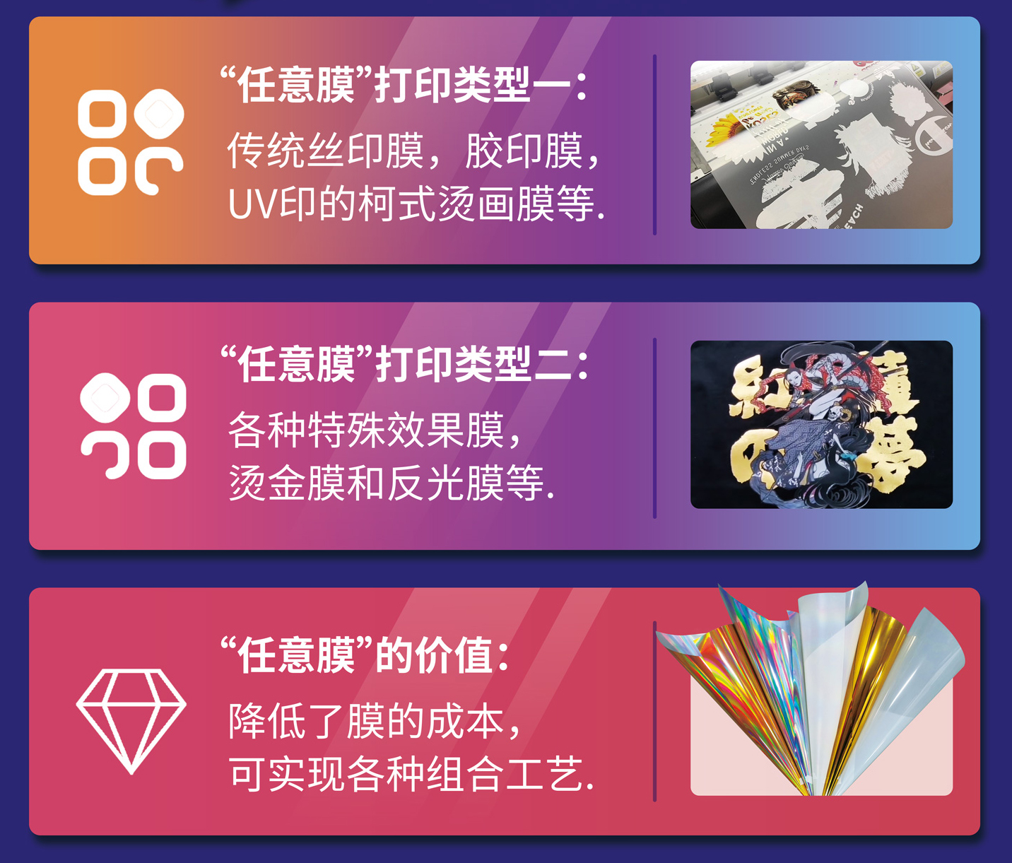 秉承著“創(chuàng)新領(lǐng)先,服務(wù)客戶”的宗旨,擁有著15年自主研發(fā)經(jīng)驗(yàn)的泰拓?cái)?shù)碼想你所想,經(jīng)過(guò)無(wú)數(shù)次的試驗(yàn),終于研發(fā)出“任意膜”技術(shù),增加一個(gè)噴頭打涂層,燙金膜、燙銀膜、鐳射膜、傳統(tǒng)膜、離型紙、反光膜、彩虹膜等皆可打印,膜的成本降低一半,還能夠?qū)崿F(xiàn)各種組合工藝!該項(xiàng)技術(shù)無(wú)疑將給印花界帶來(lái)更大的發(fā)展機(jī)遇!