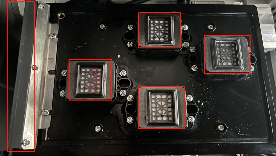 每天打印工作前后,使用棉棒和無塵布蘸清洗液,清理小車底板,清理刮片和墨棧等周邊殘留廢墨。防止固化后擦拭噴頭時(shí)將固化墨水填入噴孔,造成堵塞。