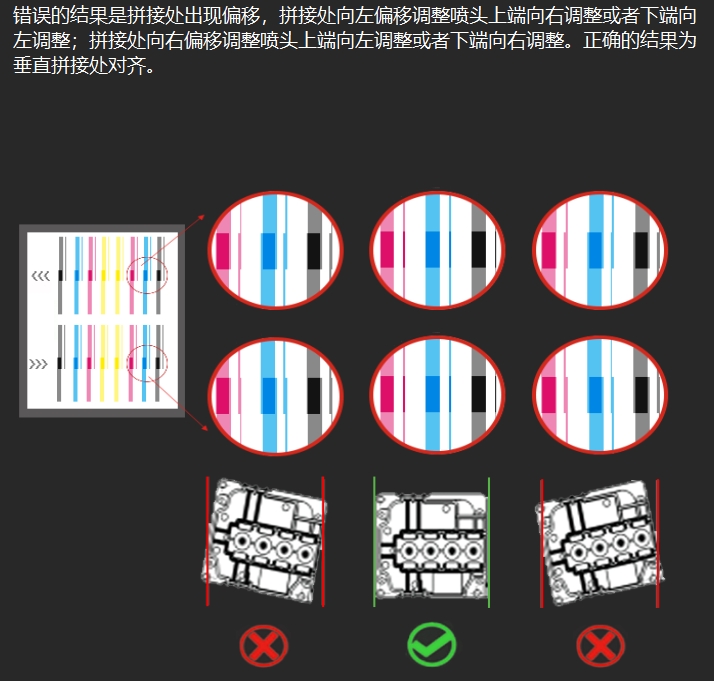 打印 "噴頭安裝-垂直檢查" 校準(zhǔn)圖,檢查打印頭是否安裝垂直,手動(dòng)調(diào)整打印頭垂直角度。