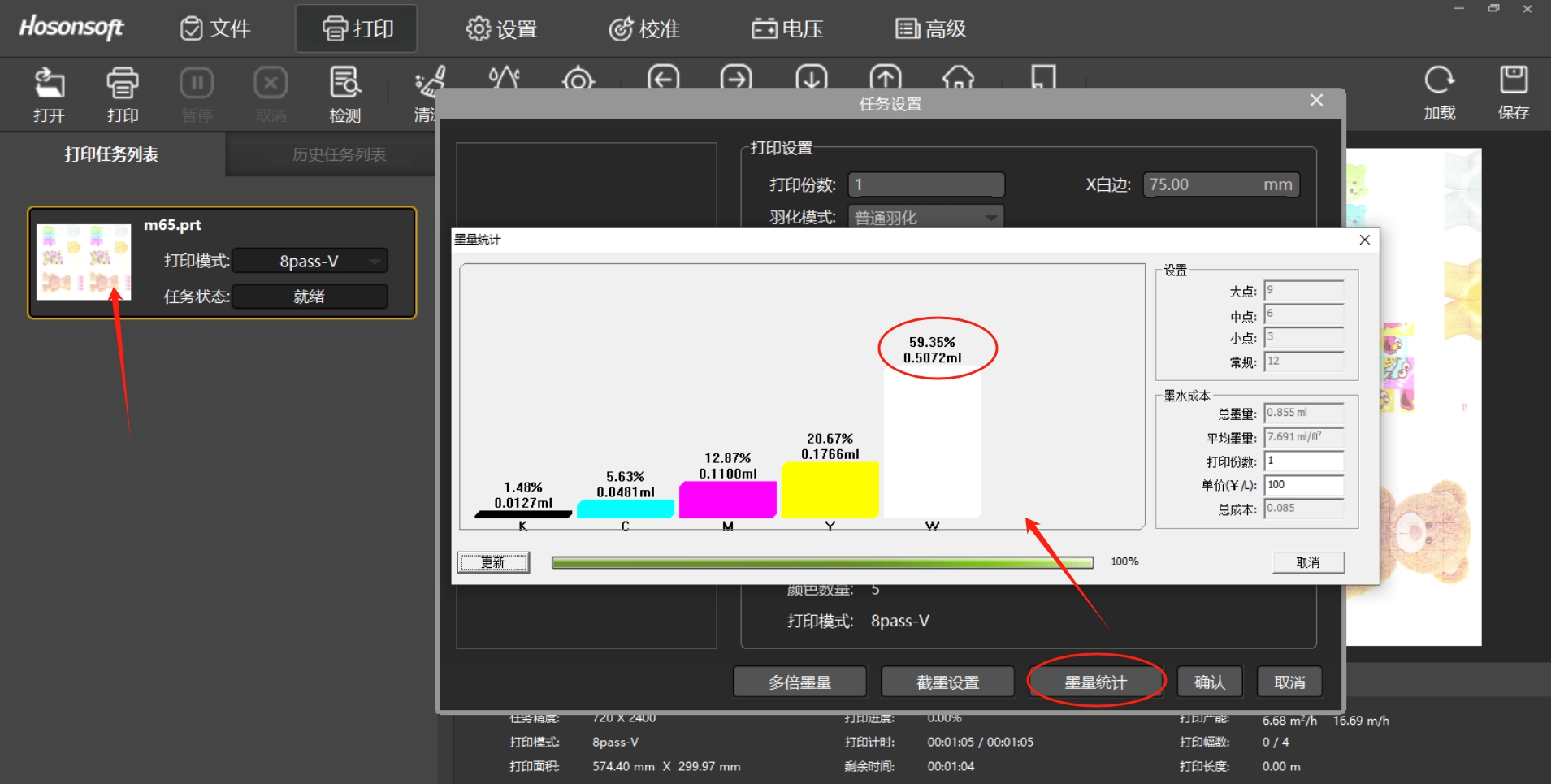 雙擊打印任務(wù)列表里面的作業(yè),然后點(diǎn)擊“墨量統(tǒng)計(jì)”,查看里面的對應(yīng)專色的墨量比例,